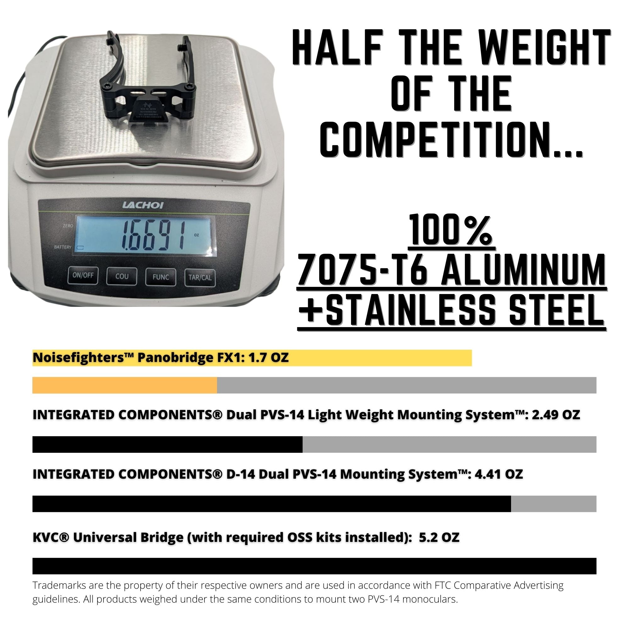 The Noisefighters Panobridge FX1 weighs only 1.7 oz total, making it the lightest all-metal bridge mount offered for professional use. This is approximately 70% less weight than the KVC® Universal Night Vision Bridge with OSS shoe sets installed, approximately 36% less than the IC® Dual PVS-14 Light Weight Mounting System, and is even 16% lighter than a single milspec polymer J-Arm. We have optimized rigidity, strength, and durability while following the Marine Corps adage of, "Ounces equal pounds, and pounds equal pain." With Nightline, Inc. NL914C Power Packs installed on each AN/PVS-14, it is possible to achieve a dual tube night vision system with individually-removable pods with a total weight of 21.6 oz, or 20.0 oz with RPO lightweight lenses installed, or 15.9 oz with Nocturn Industries Tanto monoculars + RPO lightweight lenses installed. Depending on the configuration, this can be lighter than standard night vision goggles with non-removable pods.